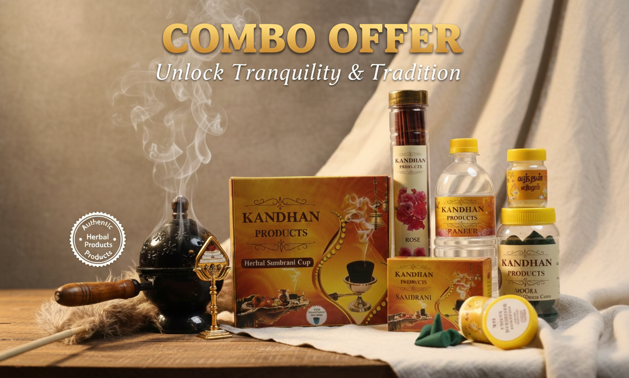 Step into a divine atmosphere with our exclusive Kandhan Products Combo Pack, thoughtfully curated to bring peace, purity, and tradition into your daily rituals. From the soothing aroma of Sambrani & Dhoop to the calming essence of rose, elachi, and herbal fragrances, this combo transforms your home into a sacred space.