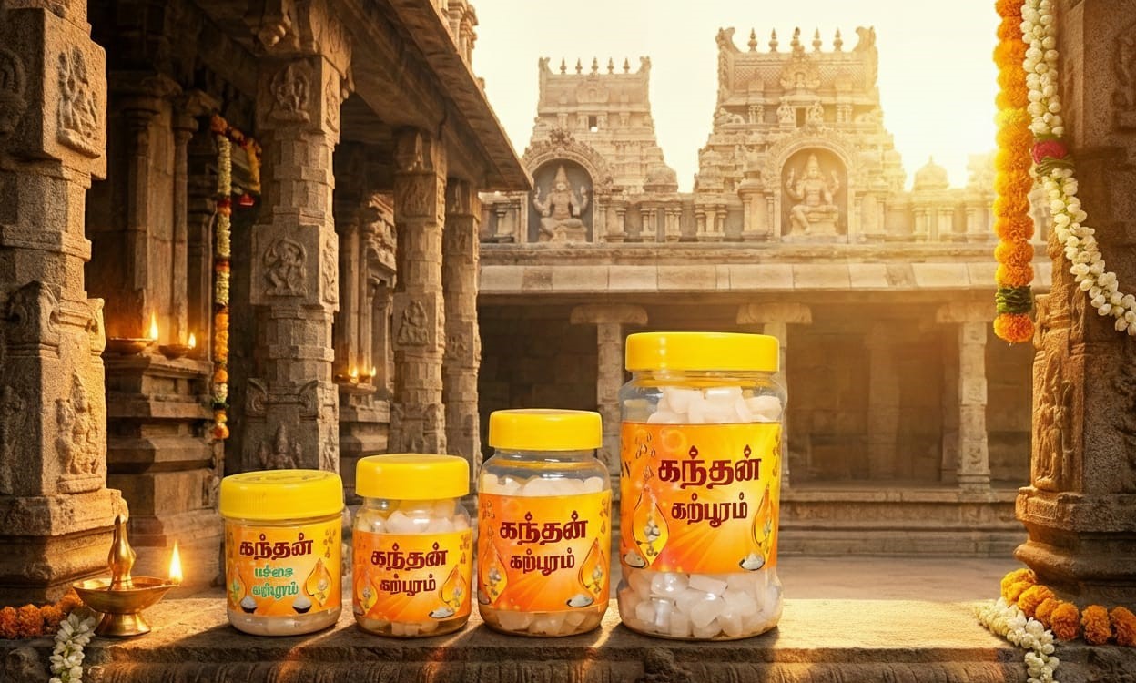 Kandhan Karpooram is made from high-purity natural camphor crystals, traditionally used in Indian rituals for purification and positivity. It burns cleanly without residue and releases a sacred aroma that purifies the mind and environment.