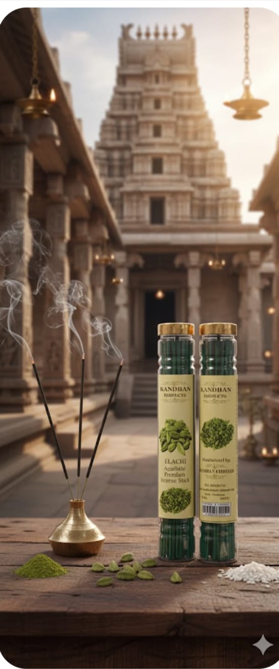 A soothing incense stick infused with the warm, sweet aroma of cardamom (elachi). It creates a refreshing, calming atmosphere, perfect for daily pooja, meditation, and uplifting your home with a gentle, natural fragrance.